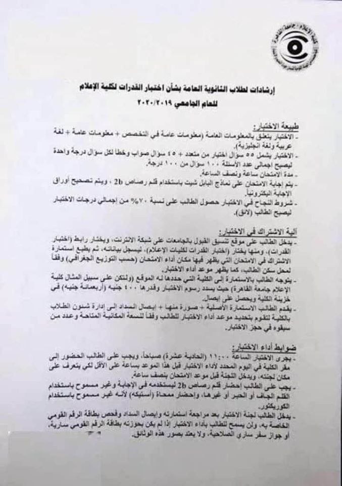 أول منشور عن تفاصيل اختبار القدرات للقبول بكلية الإعلام 2019 2020