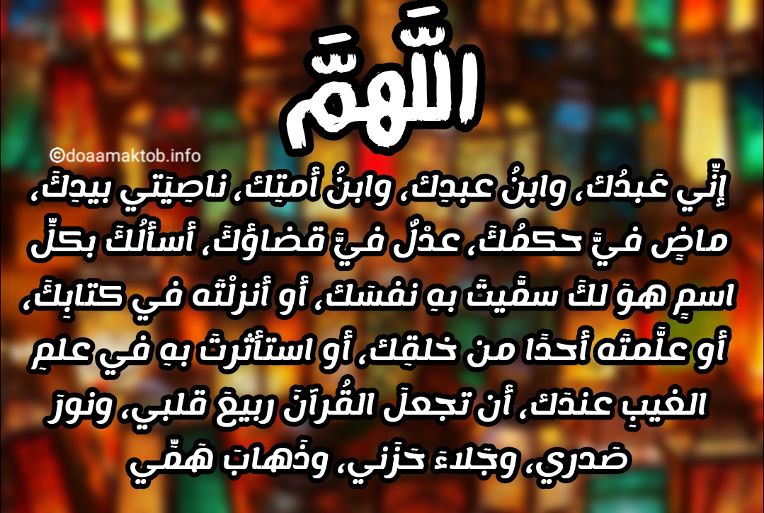 الل هم إني عبدك ابن عبدك ابن أمتك ناصيتي بيدك ماض في حكمك عدل في قضاؤك أسألك بكل اسم هو لك سميت به نفسك أو أنزلته في كتابك أو علمته أحدا من خلقك أو استأثرت به في علم الغيب عندك أن تجعل.