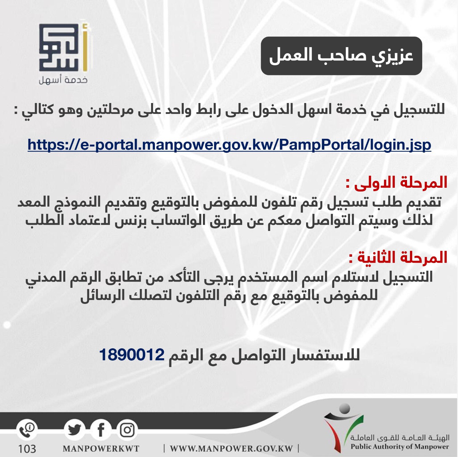 موقع الهيئة العامة للقوى العاملة دولة الكويت. موقع لطباعة نماذج الحكومية الكويتية وزارة الشؤون وزارة الداخلية وزارة التجارة والصناعة وزارة الصحة البلدية الجمارك الإطفاء نماذج الهجرة نماذج الإقامة نماذج فيزا نماذج الرواتب نماذج تجديد تراخيص. التحاق اصحاب المهن والحرف بالخدمة العسكرية الالزامية او الاحتياطية. 2 2 نموذج عقد عمل الهيئة العامة للقوى العاملة بالكويت رقم واحد.