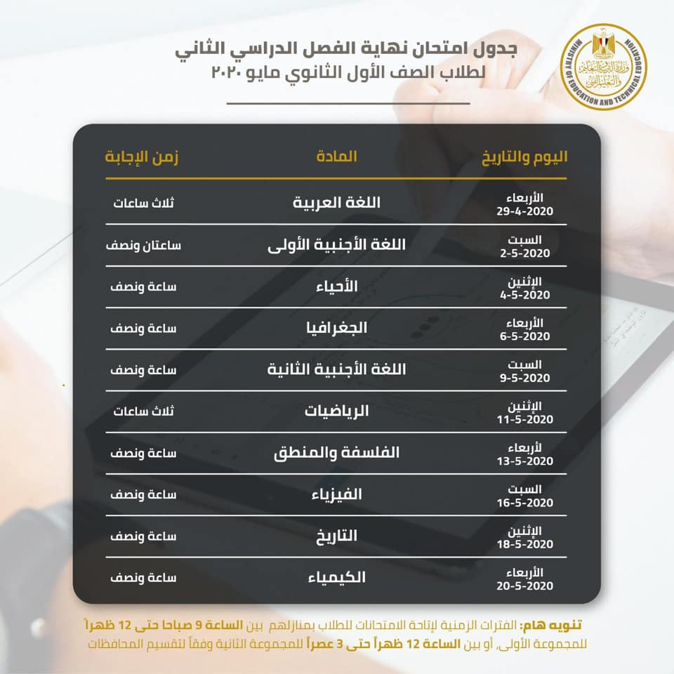 اعتمد الدكتور طارق شوقى وزير التربية والتعليم والتعليم الفني جدول امتحانات الترم الثاني للعام الدراسي الحالى 2019 2020 باستخدام التابلت لطلاب الصفين الأول والثاني الثانوي ويؤدي الطلاب الامتحانات فى المنازل فى الفترة الزمنية من التاسعة صباحا وحتى الرابعة عصرا. 2020 04 27t19 19 09z الاثنين 27 أبريل 2020 07 19 م. طارق شوقى وزير التربية والتعليم صورة أرشيفية تصوير. مادة اللغة العربية من الساعة الواحدة ظهر ا إلى الرابعة عصر ا.