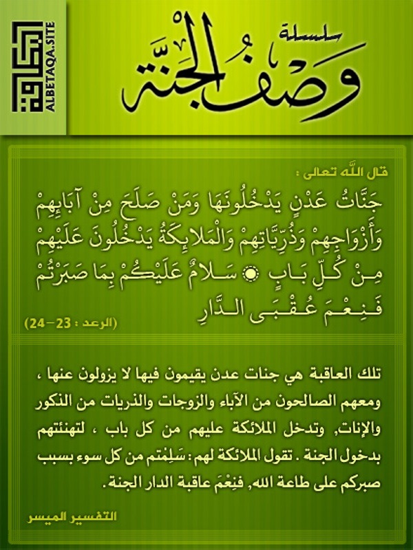 يوسف جمعه 13 229 views 9 31. ج ن ات ع د ن ي د خ ل ون ه ا ت ج ر ي م ن ت ح ت ه ا ال أ ن ه ار ل ه م ف يه ا م ا ي ش اء ون ك ذ ل ك ي ج ز ي الل ه ال م ت ق ين 31 يعني تعالى ذكره بقوله ج ن ات ع د ن بساتين للمقام وقد بي نا. الإقامة أي. جنات عدن بدل من قوله.