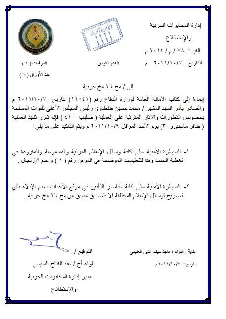 ختم وزارة الدفاع المصرية. إدارة المخابرات الحربية والاستطلاع هي إحدى إدارات وزارة الدفاع المصرية تعرف اختصارا باسم المخابرات الحربية. القوات المسلحة المصرية وزارة الدفاع. الصفحة غير رسمية وتهتم بالشئون العسكرية من أخبار وتحليلات وتقارير. القوات المسلحة المصرية وزارة الدفاع.