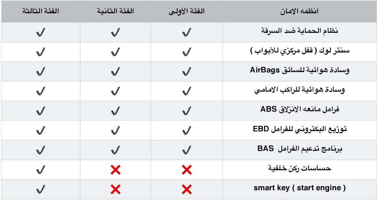 و فئاتها حتى انظمه الامان و القيادة والتجهيزات الخارجية والداخليه.