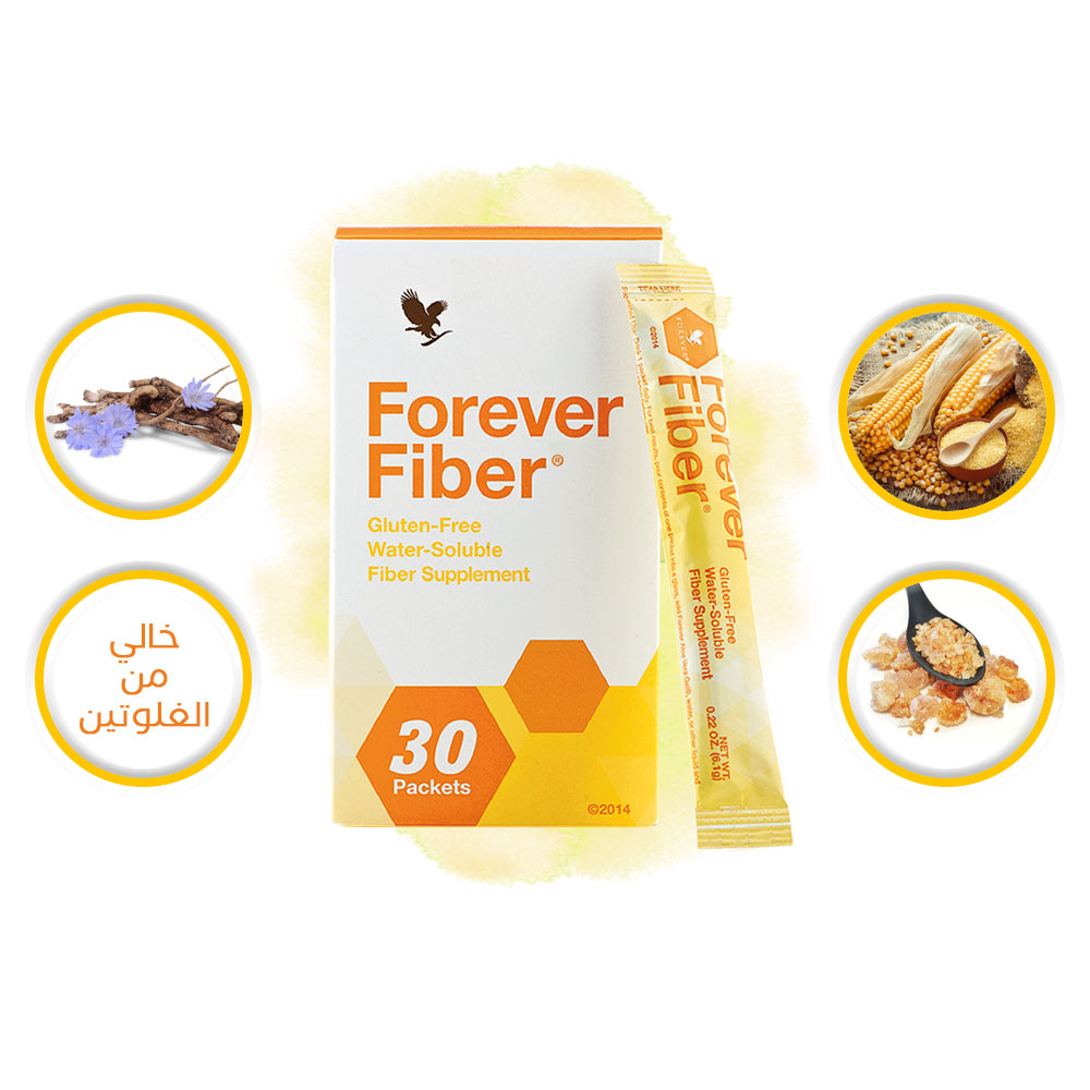 فوريفر فايبر. فوريفر فايبر الألياف جزء ضرورى من الغذاء الصحى المتكامل فهى سبب اساسى فى صحة الجهاز الهضمى أغلب أطعمتنا لا تكون غنية بالألياف الطبيعية لذلك فلا نحصل على الألياف التى يحتاجها جسمنا فمعظم الناس يحصلون على ما يعادل نصف. فوريفر فايبر forever fiber يحتوي على أربعة أنواع من الالياف منها فركتو أوليجو سكاريدات الذي يعد أحد مغذيات البريبيوتيك. فوريفر فايبر هو عبارة عن أكياس من الألياف الطبيعية سريعة الذوبان لدعم النظام الغذائي الصحي يوصي الخبراء به ولكن للأسف فإن معظم الناس يستهلكون فقط ما يقرب من نصف هذه الكمية. فوريفر فايبر forever fiber هو مكمل غذائي يمد الجسم بما يحتاجه يومي ا من الألياف الغذائية الطبيعية من إنتاج شركة فوريفر ليفنج الأمريكية.