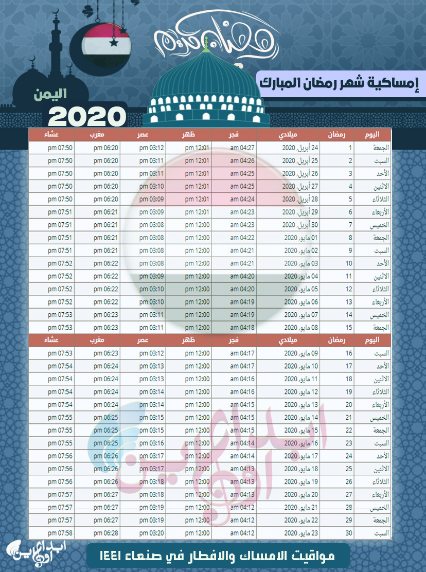 امساكية رمضان 2020 اليمن مواقيت الصلاة والامساك توقيت صنعاء