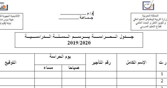 أعلنت مديرية التربية والتعليم بالشرقية عن مشروع مقترح لخطة الدراسة للعام الدراسي 2020 2021م للمرحلة الإبتدائية. جدول حراسة يتطابق مع مدكرة التوقيت الجديد م 122 ملاحظات هامة. سجلات أمين التوريدات 1. 1ينبغي إيلاء الحراسة الأهمية التي تستحقها بكل مسؤولية تلافيا لوقوع حوادث مدرسية 2كل أستاذ ة مسؤول ة عن تلاميذه ها وقت الدخول والخروج 3كل أستاذ ة مسؤول.