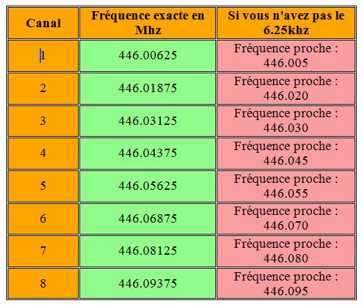 Tableau frequence pmr446. Pmr446 est l abréviation de professional mobile radio quelque fois déclinée en private personal mobile radio. Tout comme autrefois les canaux d appel ou d urgence sur la cibi 27mhz ce plan de bande n est pas obligatoire mais il donne du sens à une collectivité muée par un même plaisir celui de la radio. Le nombre 446 est la fréquence de 446 mhz située dans ce que l on appelle l uhf ultra haute fréquence. Uk nationwide frequencies pmr446 analogue.