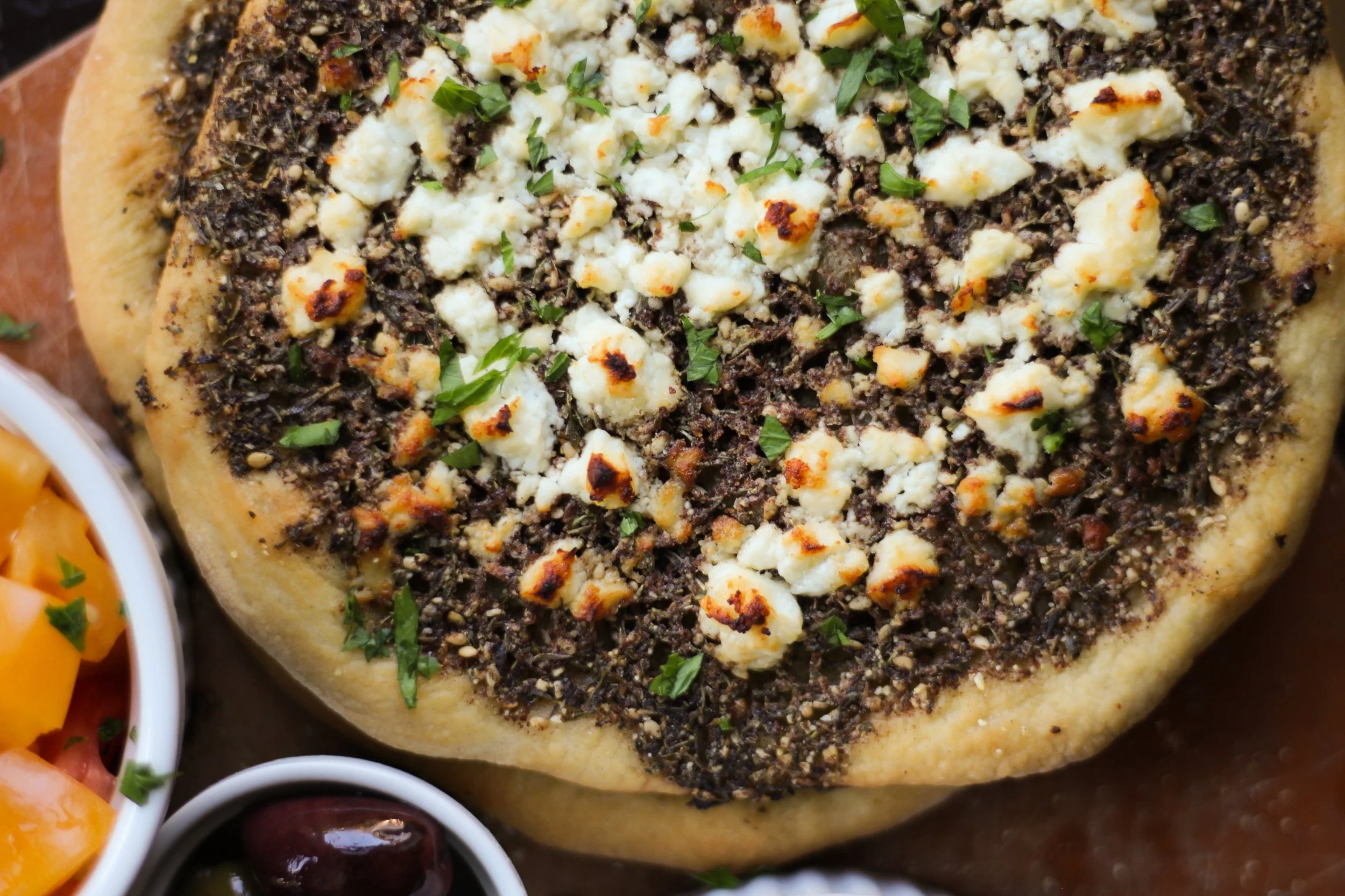 Zaatar arabic pizza. Za atar is the condiment king of middle eastern cuisine and there are very few savory dishes that could not be improved with a dash of this versatile mixture. It s bursting with flavors and can be served as a snack or for breakfast lunch and even dinner. This recipe is my take on pizza inspired by manaeesh. The result is soft and layered seasoned bread.